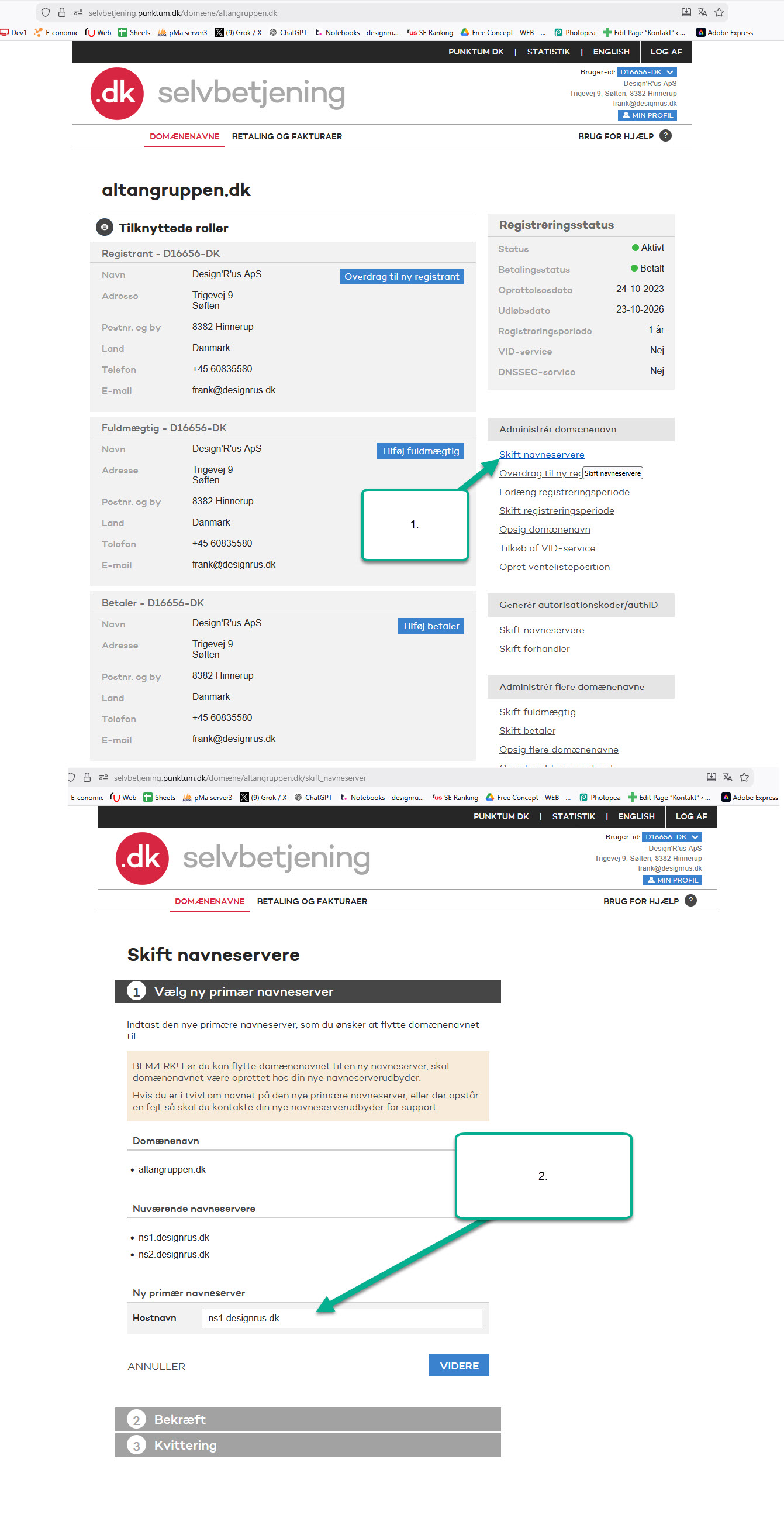 Redeleringen udføres på punktum.dk – og deres login funktion, sikker med dit MitID. Se billedet nedenfor, som viser hvordan domænet flyttes. I feltet med hostnavn, skal der skrives: ns1.designrus.dk